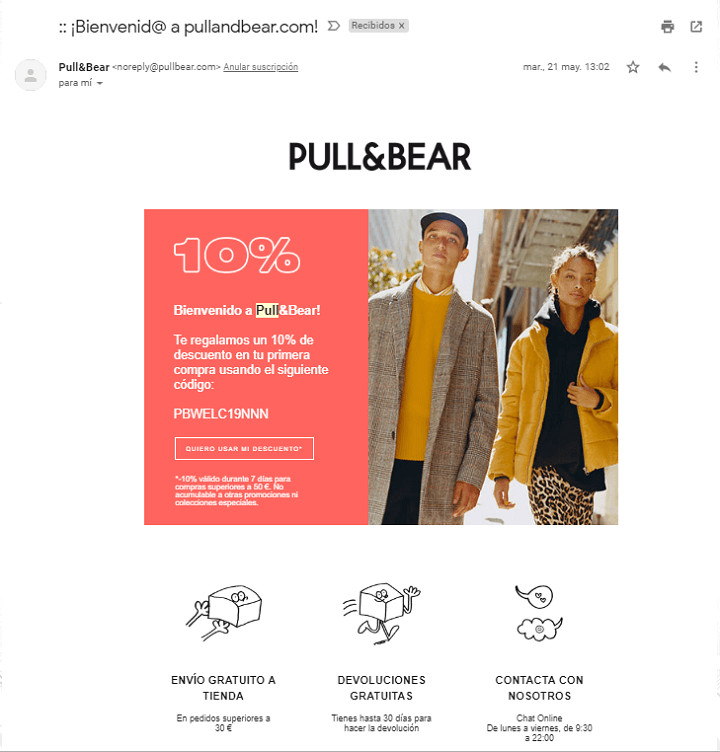 Un email de bienvenida o un email de agradecimiento por la suscripción que incluya un cupón de descuento es una buena acción para iniciar una relación con el suscriptor,