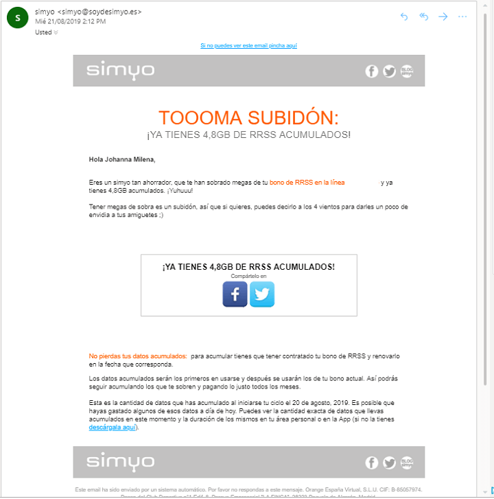 Una buena práctica a implementar es enviar un email premiando la fidelidad del cliente, recuerda que él se convierte en un portavoz de tu marca y hay que consentirlo. Un ejemplo de ello es esta empresa de telefonía móvil que como modo de fidelización a sus clientes incluye las megas de datos no utilizadas del mes anterior al mes en curso.