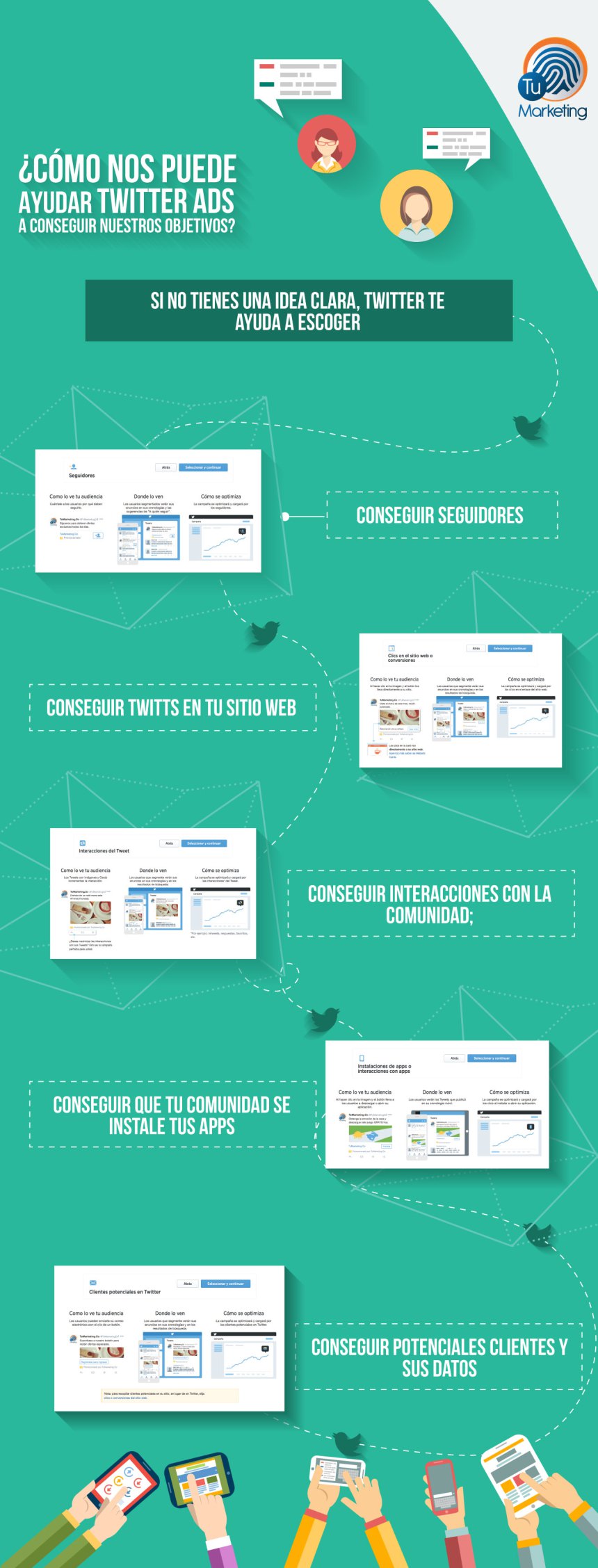 A continuación les dejamos una infografía sobre ¿Cómo nos puede ayudar Twitter Ads para conseguir objetivos?