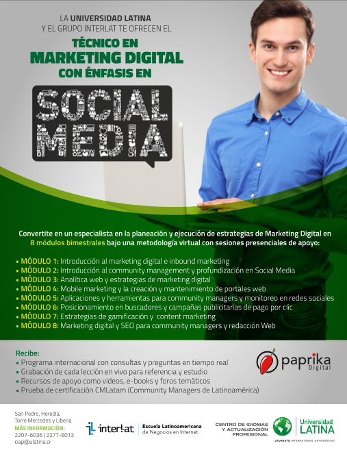 Nos alegramos en informar que la Universidad Latina de Costa Rica ofrecerá los primeros Técnicos en Marketing Digital virtuales y en tiempo real con nuestros profesores de todas partes del mundo certificados por Interlat y Paprika Digital.