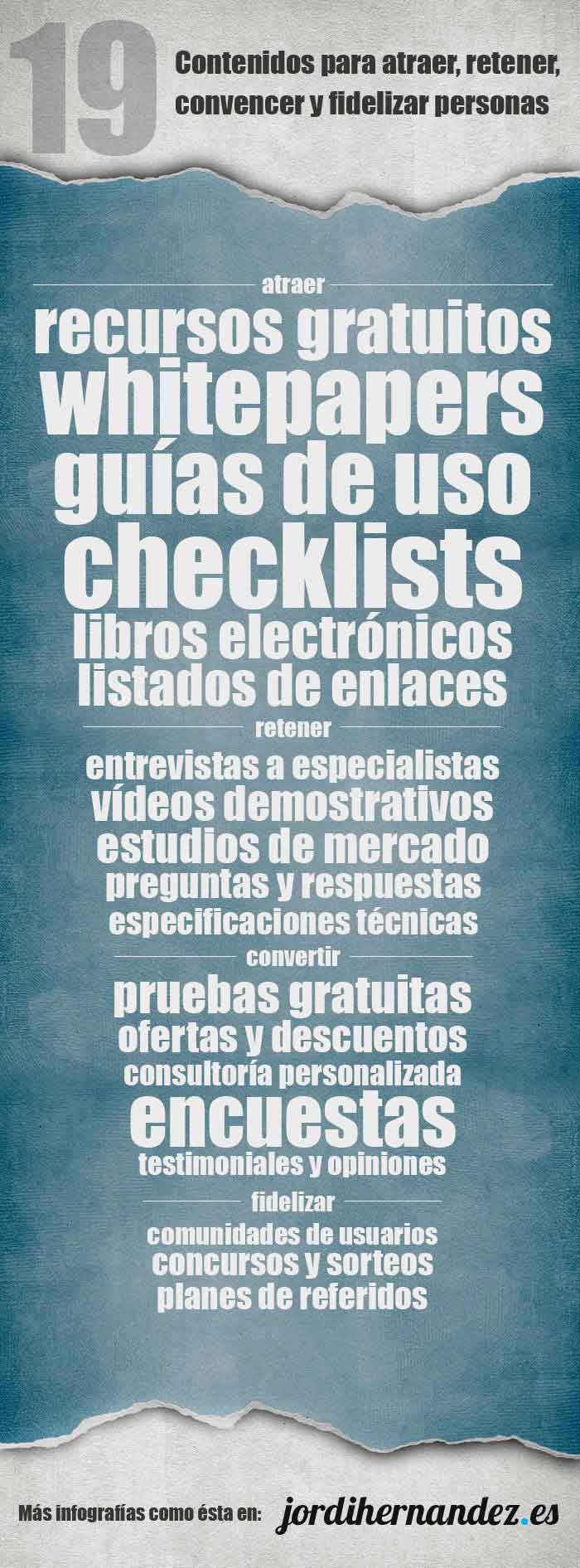 A continuación, te presentamos una infografía con los 19 contenidos para atraer, retener, convencer y fidelizar personas: