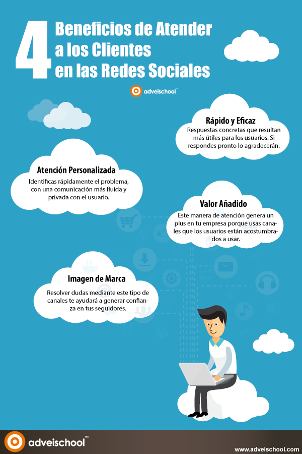 A continuación, te presentamos una infografía con los 4 beneficios de atender a los clientes en las redes sociales: