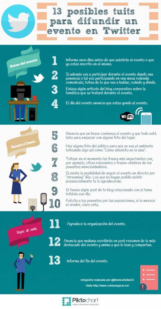 A continuación, te presentamos una infografía con los 13 posibles tuits para difundir un evento en Twitter.