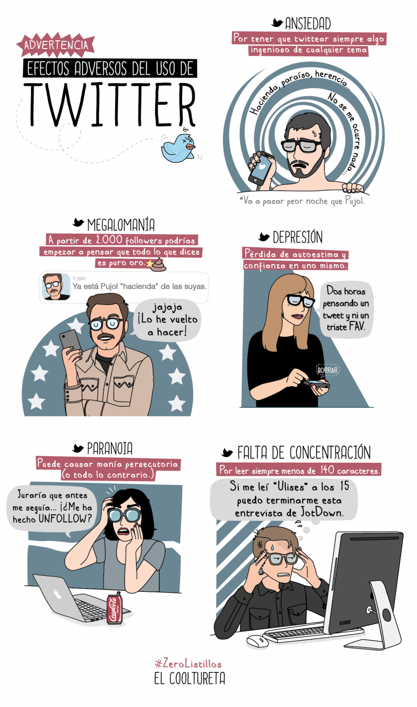 Enfocándonos más en los usuarios de Twitter, según estudios que se han realizado, se sabe que el rango de edad de dichos usuarios es de 35 a 49 años aproximadamente, es decir, es un público más adulto, a diferencia de Instagram, por ejemplo. A continuación, te mostramos una infografía con los efectos adversos del uso de Twitter.
