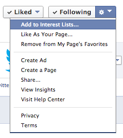 1) Ingrese al Perfil de «nombre de tu página», coloque el «mouse» sobre la palabra «me gusta» y haga clic en «añadir a listas de intereses».