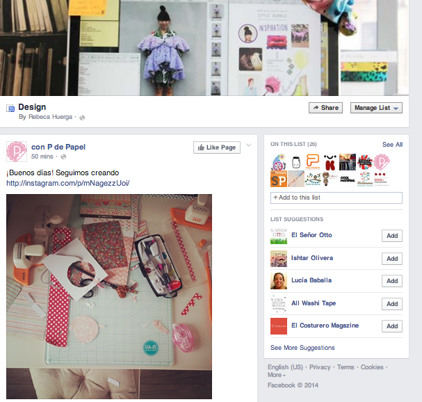 Además, la edición de las listas y la búsqueda de páginas nuevas relacionadas con una lista concreta es muy sencilla (Facebook nos sugiere páginas relacionadas). Un ejemplo visual de una de las listas creadas “Design”: